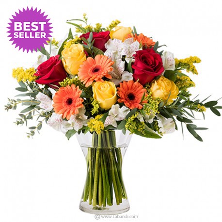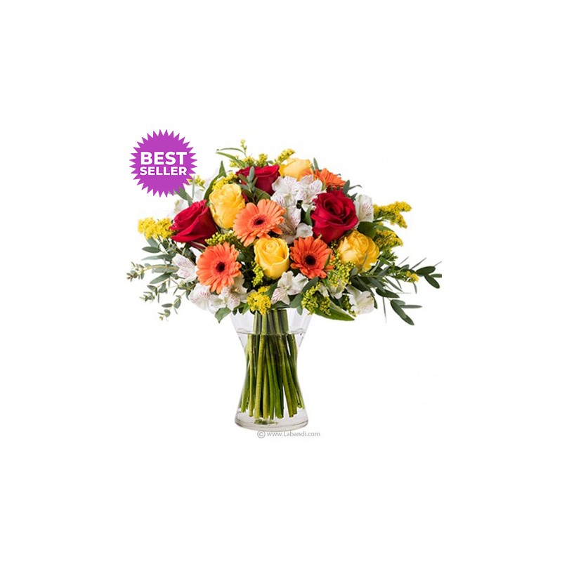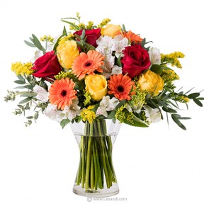 This magnificent arrangement boasts a glorious combination of red roses, yellow roses,orange gerberas and chrysanthemum blooms in a clear glass vase.All flower arrangements are created in-house by Labandi.com's floral department.