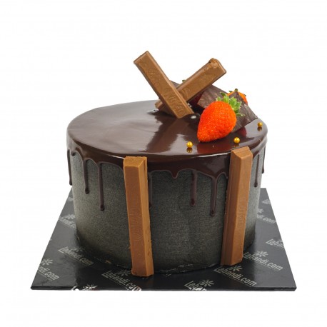 This layered drip cake is smothered in icing and drizzled with a dark chocolate ganache It is a chocolate cake layered with chocolate butter icing, covered and decorated with Kitkats and a Strawberry. – a stunning centrepiece for a big occasion