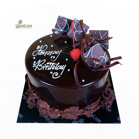 A Chocolate butter cake layered with chocolate butter icing, covered with creamy chocolate ganache, and decorated with chocolate curls, box-shaped chocolate chips, and a cheery on top of it.