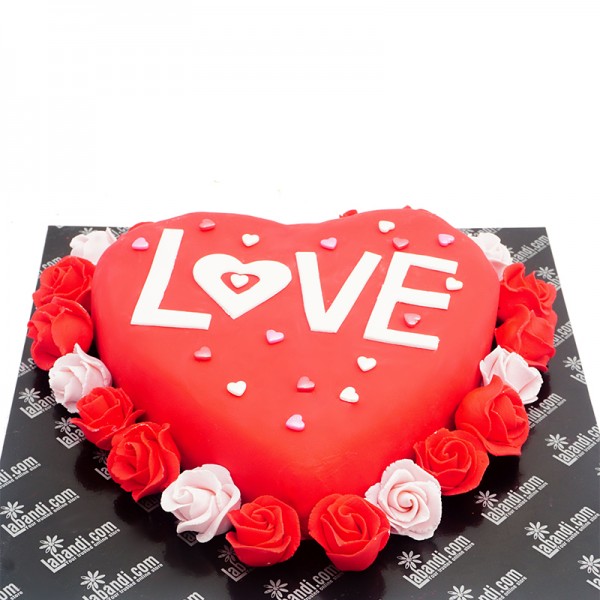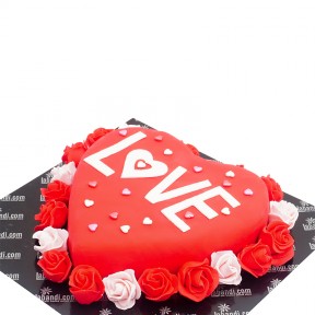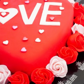 Vanilla Butter Cake layered vanilla butter icing,covered with Fondant, topped with mini-hearts and Fondant Flower garnish.